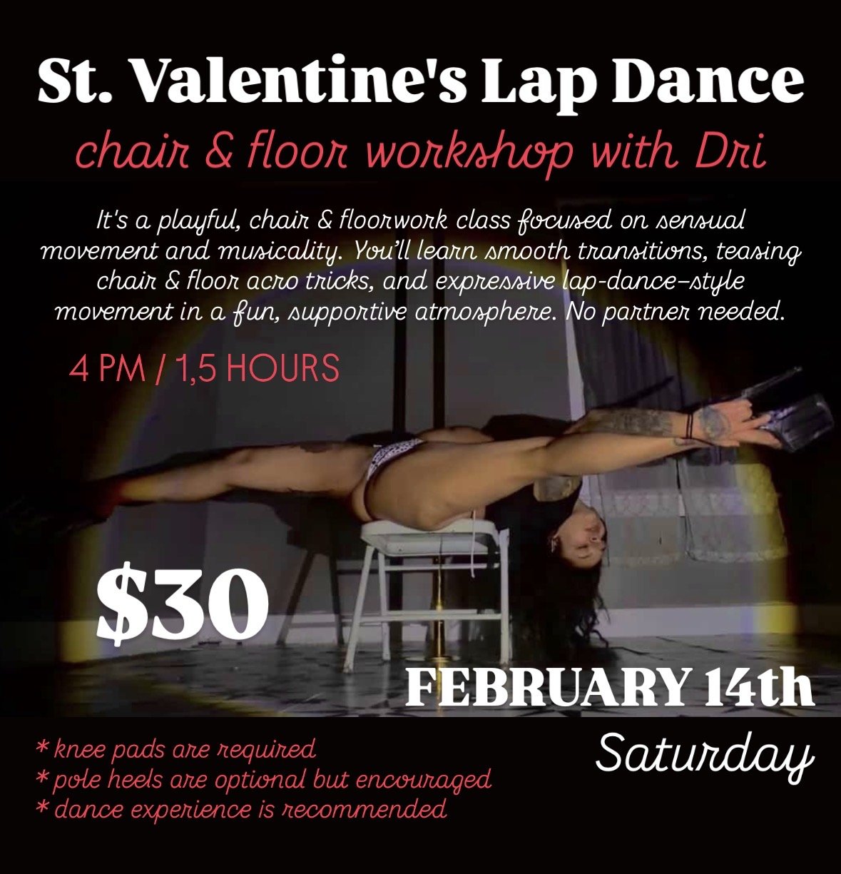 It's a playful, chair & floorwork class focused on sensual movement and musicality. You’ll learn smooth transitions, teasing chair & floor acro tricks, and expressive lap-dance–style movement in a fun, supportive atmosphere. No partner needed.